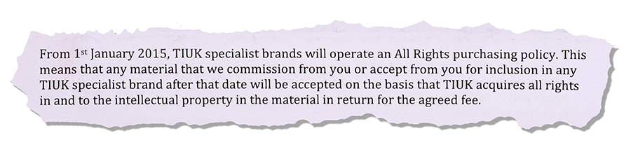 Regarding the All Rights agreement that is being sent to Time Inc. (UK) specialist contributors, it has been our practice for a number of years to ask many of our freelance contributors to enter into either an All Rights or Qualified Rights agreement when we purchase content from them. In many instances we’ve asked contributors to sign on-going agreements to cover all the material that they sell to Time Inc. called ‘Core Rights Agreements’. So the agreements that are now being dispatched, while they have been updated and re-worded, are not a new innovation and having a Core Rights Agreement in place ensures that payments can be made to contributors much more speedily than might be the case if individual contracts had to be sent out and agreed on a job-by-job basis.